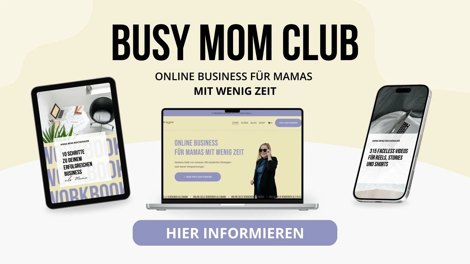 Der BUSY MOM Club ist eine monatliche Mitgliedschaft für Mütter, die sich ein eigenes Online-Business aufbauen möchten – strukturiert, praxisnah und ohne Social-Media-Stress. Mit regelmäßigen Live-Calls (wöchentlich). Jederzeit monatlich kündbar.